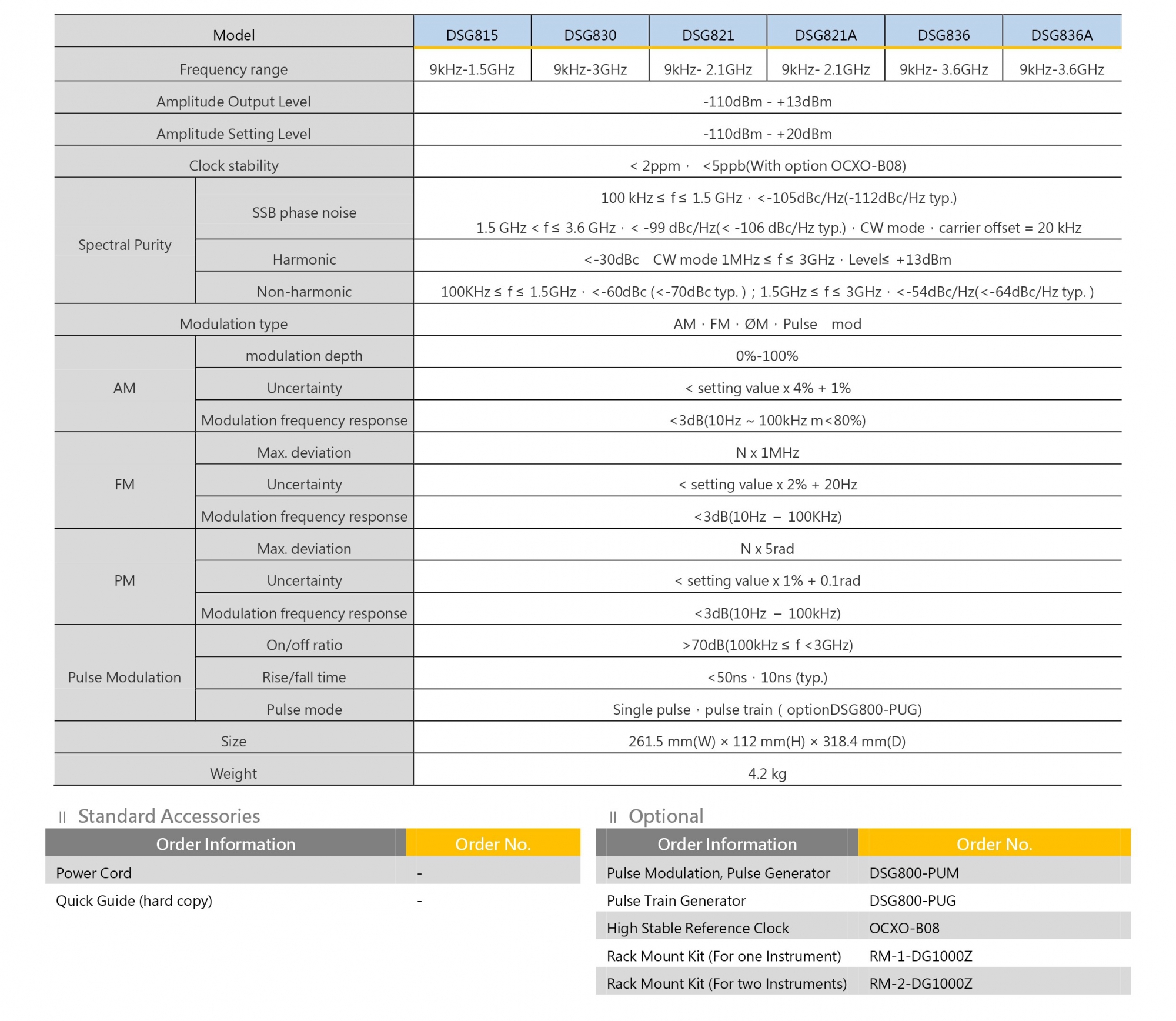 產品特色: DSG821A射頻信號產生器在同級別的經濟型射頻訊號源中,性能出眾,具備完備的頻率和功率掃描功能,以及AM/FM/ØM類比調變、強大的脈衝調變功能和全新添加的IQ調變功能。與同類產品相比,DSG800桌面佔用面積小,重量輕,具有出眾的便攜性,是教育實驗室、工業生產線、開發和研究等應用的最佳選擇。功能說明: