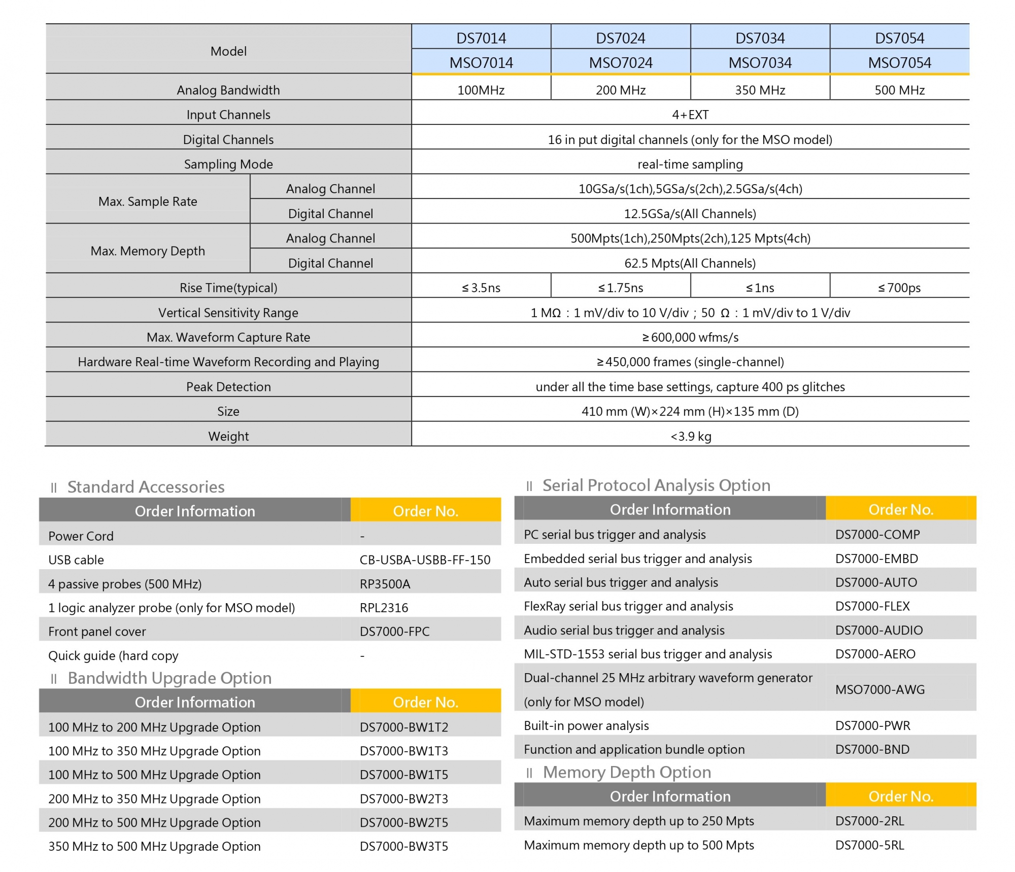 產品特色: MSO7000/DS7000系列數位示波器是基於RIGOL獨創的UltraVision II代技術 的多功能、高性能數位示波器,集7種儀器於一身,具有超高的採樣頻寬比和儲存深度、良好的顯示效果、優異的波形捕獲率和強大的資料分析功能。 功能說明: •類比頻道頻寬:500 MHz •支援頻寬升級選件 4個類比頻道,1個EXT通道,選配16個數位通道 •即時取樣速率最高達10 GSa/s •最高存儲深度達500 Mpts(選件) •波形捕獲率高於600,000個波形每秒 •多達45萬幀的硬體即時波形不間斷錄製和重播功能 •集7種獨立儀器於一身,包括:示波器、16通道邏輯分析儀、頻譜分析儀、 任意波發生器、數位電壓表、6位元頻率計和累加器、協定分析儀 •豐富的串列協定觸發和解碼功能 •多達41種波形參數自動測量,更提供全記憶體硬體測量功能 •多種數學運算,內置增強FFT分析和峰值搜索功能 •標配波形長條圖分析 •獨立的搜索、導航按鍵和事件清單 •內置高級的電源分析軟體(選件) •用戶可定義的Quick一鍵快捷操作 •10.1英寸多點觸控電容屏,256級波形灰度顯示 •豐富的介面:USB Host & Device、LAN(LXI)、HDMI、TRIG OUT、USB-GPIB •支援Web Control遠端命令控制 •獨有的線上版本升級功能